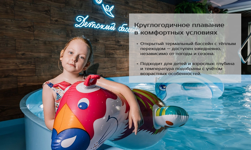 - Тёплый детский бассейн внутри комплекса — безопасно даже для самых маленьких